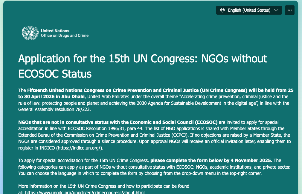 The Congress Secretariat is pleased to inform you that the Fifteenth United Nations Congress on Crime Prevention and Criminal Justice (UN Crime Congress) will be held in Abu Dhabi, United Arab Emirates, from 25 to 30 April 2026, with pre-session consultations scheduled for Friday, 24 April 2026. The overall theme for this Congress is “Accelerating crime...